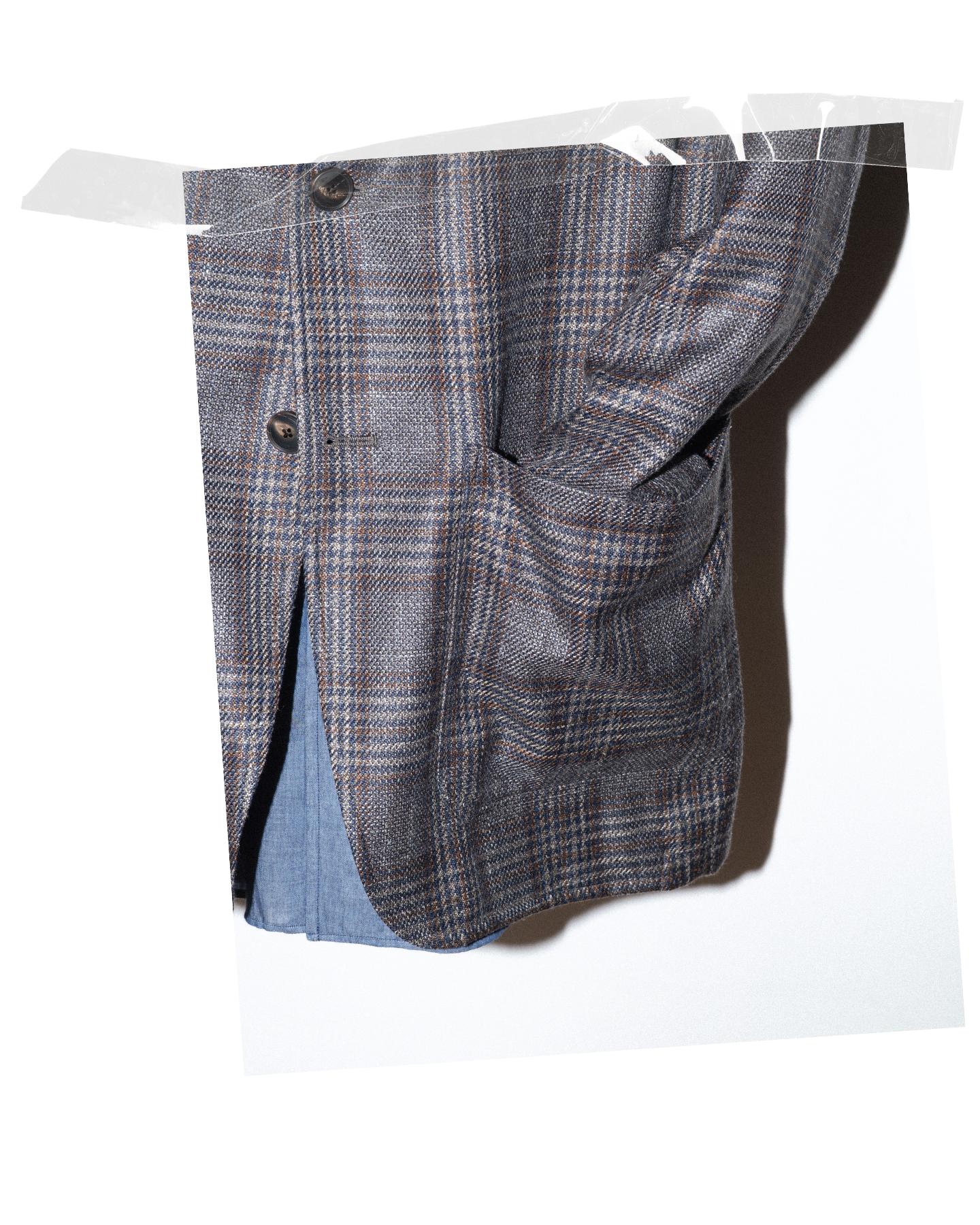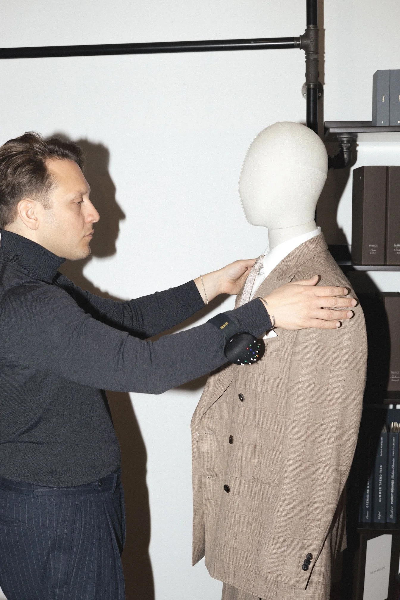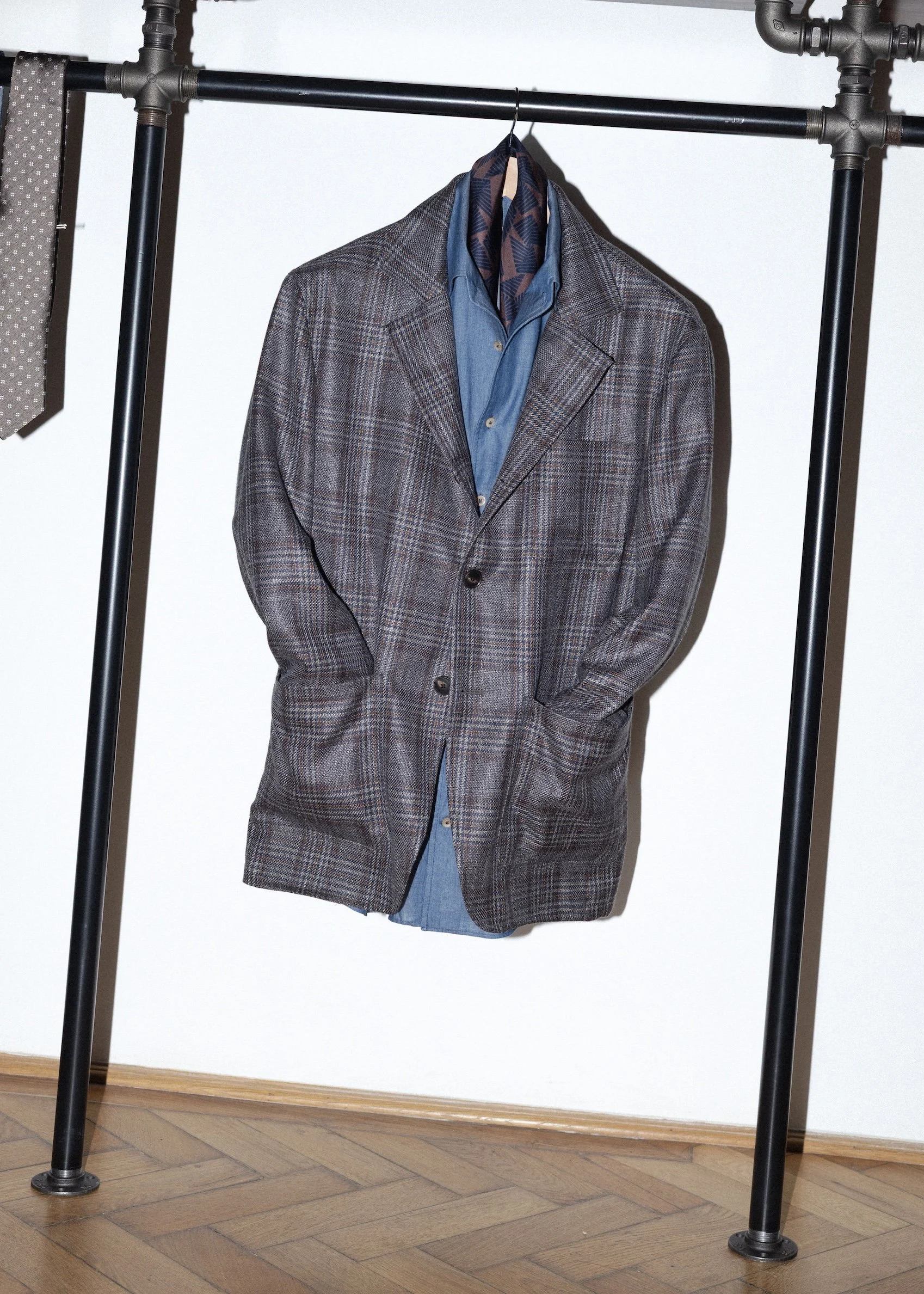 A bemutatott darab Loro Piana gyapjú–selyem–len keverékű kockás anyagból készült, amely légáteresztő és természetes módon ellenáll a gyűrődésnek, így különösen jól használható a melegebb évszakokban is.