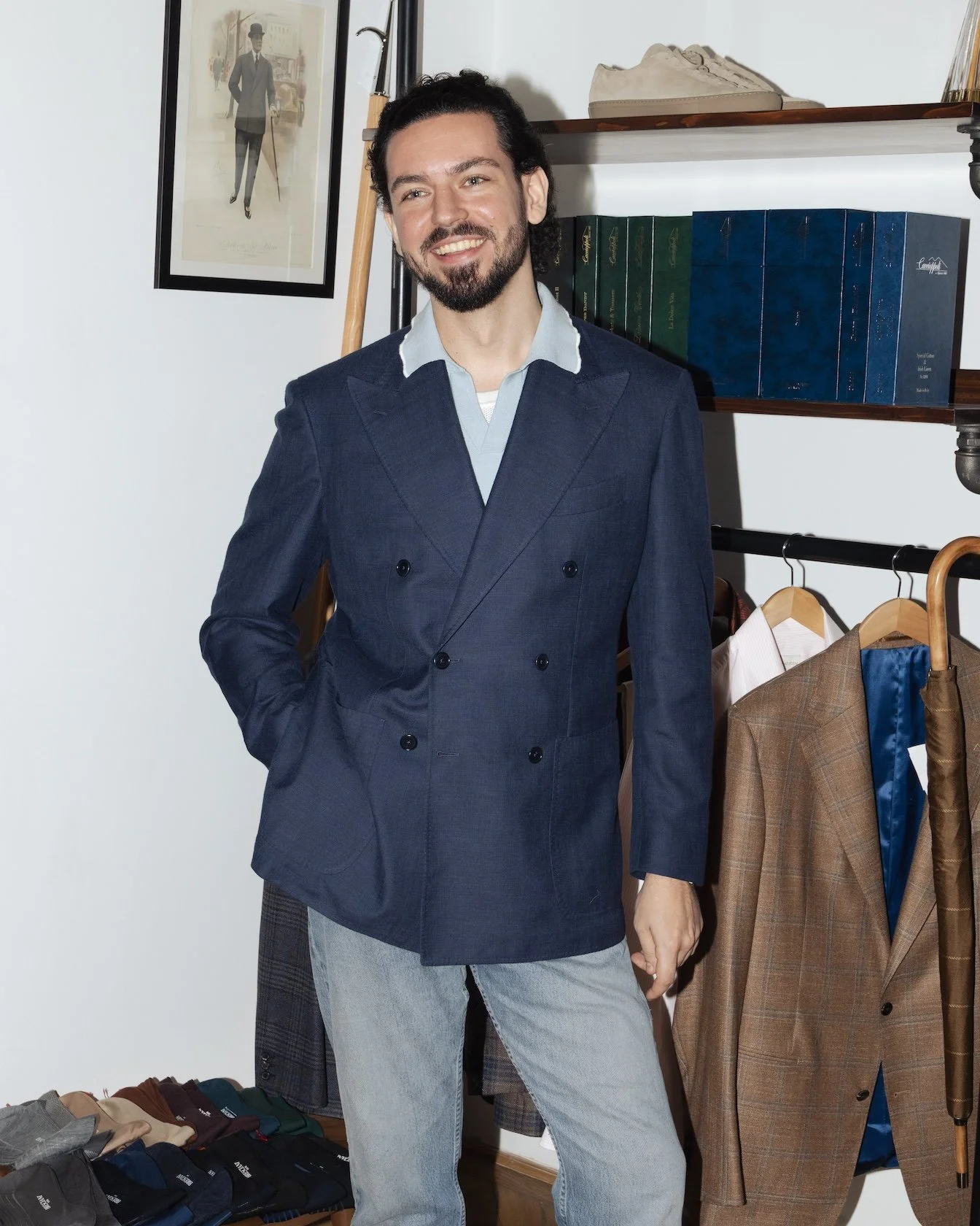 A klasszikus, egyedi készítésű szabászat hagyományaihoz hűen az ügyfelek több száz különböző anyagból választhatnak, hogy saját, személyre igazított Travel Jacket darabjukat alkothassák meg.